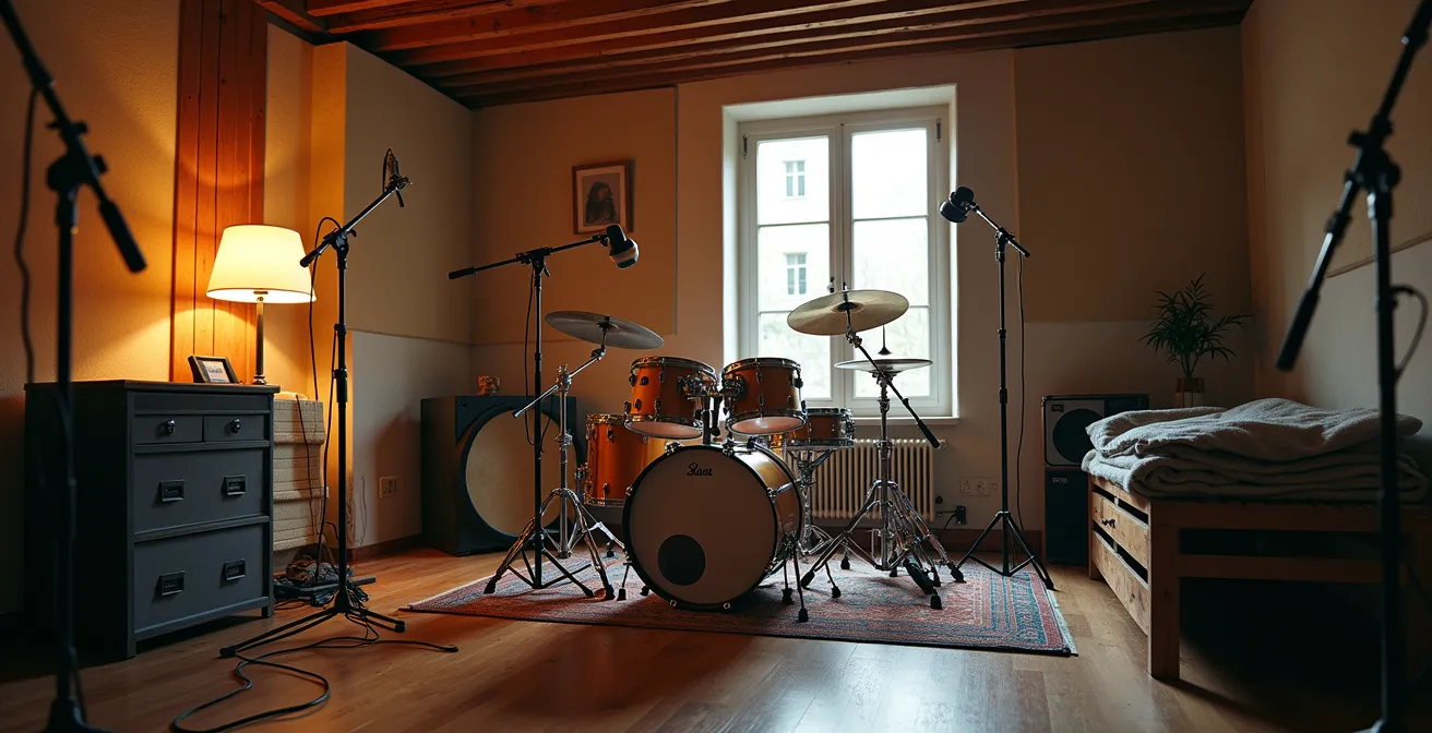 Et si la solution n’était pas dans l’accumulation de matériel, mais dans une approche plus minimaliste et réfléchie ? Si la contrainte budgétaire était en réalité une chance, nous forçant à nous concentrer sur l’essentiel ? La véritable clé d’un bon enregistrement de batterie ne réside pas dans le nombre de micros, mais dans leur placement chirurgical, la maîtrise de la phase acoustique et une préparation intelligente de l’instrument et de la pièce. C’est une philosophie de « moins mais mieux » qui a fait ses preuves sur les plus grands albums de l’histoire.